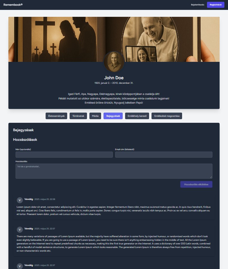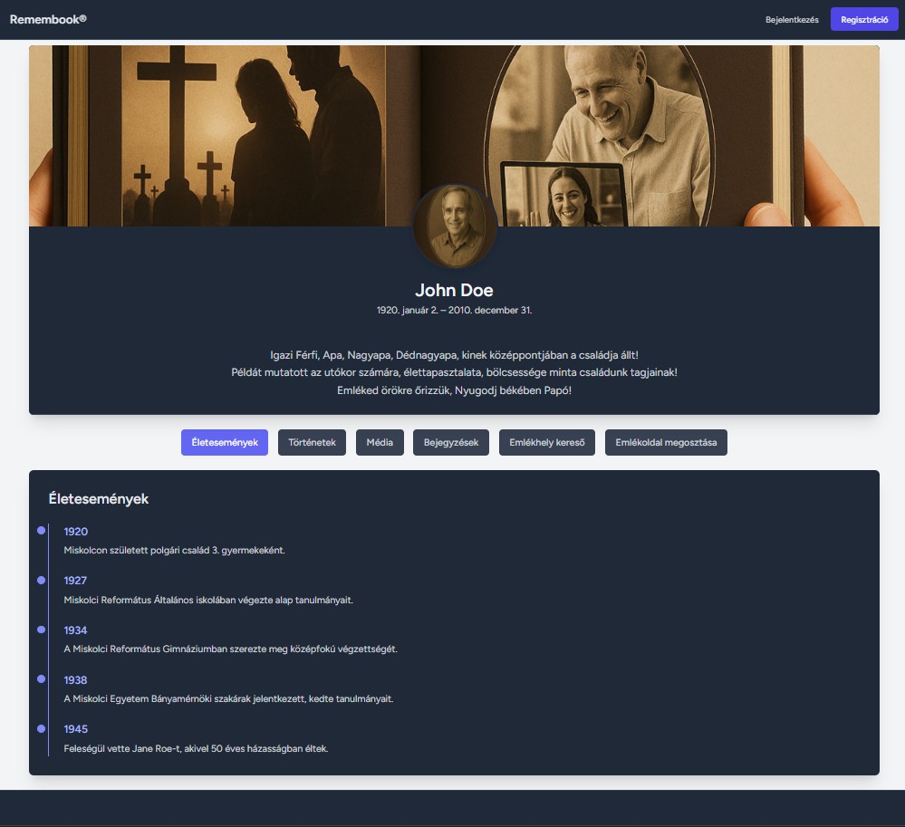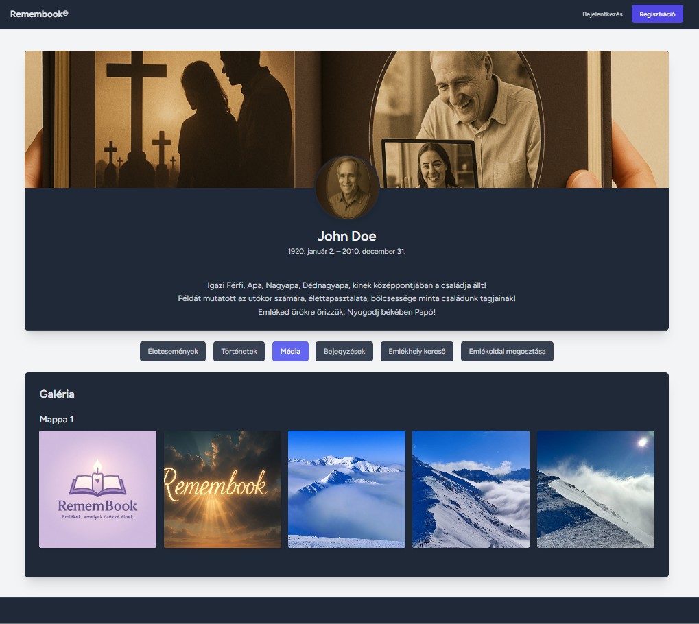A Remembook® virtuális kegyeleti tereiben lehetősége nyílik arra, hogy eltávozott hozzátartozója tiszteletére egy emlékkönyvben mélyen személyes emlékoldalt hozzon létre. Olyan digitális szentélyt, ahol megoszthatja azokat a közös fotókat, videófelvételeket, szívből fakadó történeteket és meghitt megemlékezéseket, amelyek örökre összekötik Önöket. A könyvet Ön szerkeszti, az oldalt Ön formálja és óvja meg a legnagyobb szeretettel és gondoskodással, hogy méltóképpen tükrözze az eltávozott egyediségét és a közös múltnak legféltettebb kincseit, őrizve emlékét az idők végezetéig.